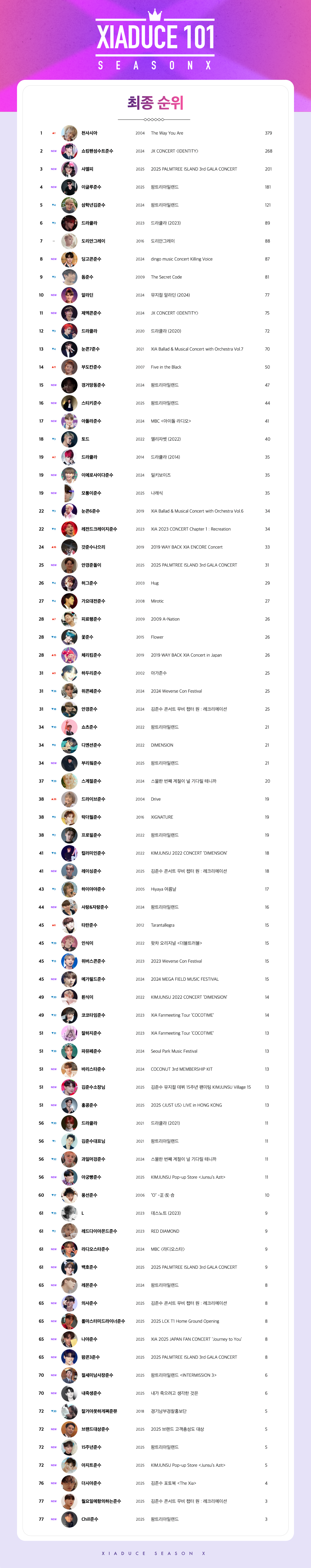 | XIADUCE SEASON X - 1차 투표 순위 (0) | 2025.08.10 |